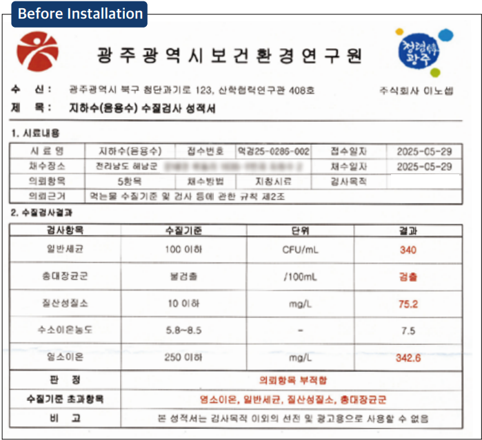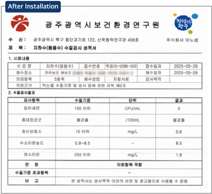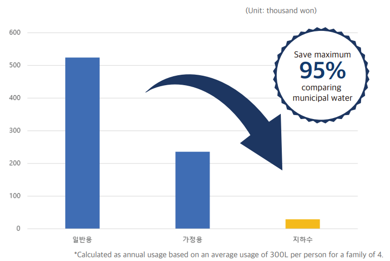 *Compared to the combined cost of municipal water installation fees and usage charges, our groundwater system -including installation, equipment, and filter replacement- offers at least 30% greater cost efficiency.(Water rate standards for the K-water.)